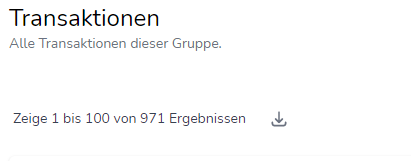 Ein Übersicht über die Transaktionen der aktuellen Gruppe inkl. aller Untergruppen erhalten Sie über den Menüpunkt Transaktionen. Die Transaktionen sind nach Startzeitpunkt absteigend sortiert. D.h. Sie sehen die zuletzt gestartete Transaktion ganz oben in der Liste. Eine Aktualisierung der angezeigten Daten während der Listenanzeige findet nicht statt! Über das Downloadsymbol neben der Ergebnisanzahl kann eine CSV-Datei zur Weiterverarbeitung der Transaktionsdaten heruntergeladen werden.