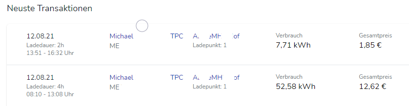 Hier werden die letzten 10 Ladevorgänge innerhalb der gewählten Gruppe angezeigt. Innerhalb der einzelnen Listenelemente können Sie über Links direkt zu den verwendeten Ladekarten oder der genutzten Ladesäule springen. Die Preisinformation ergibt sich aus dem Preis, der in der Gruppe der Ladestation hinterlegt ist.