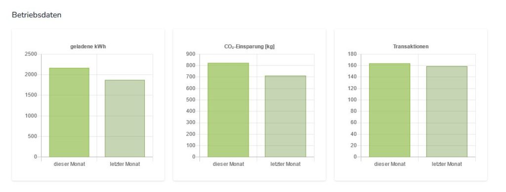 Im Bereich Betriebsdaten finden Sie eine Chart-Ansicht zu den geladenen kWh und der Anzahl der Ladevorgänge von der aktuellen und der vorherigen Woche sowie die rechnerische CO² Einsparung (nur Fahrbetrieb), die sich aus den kWh ergibt.