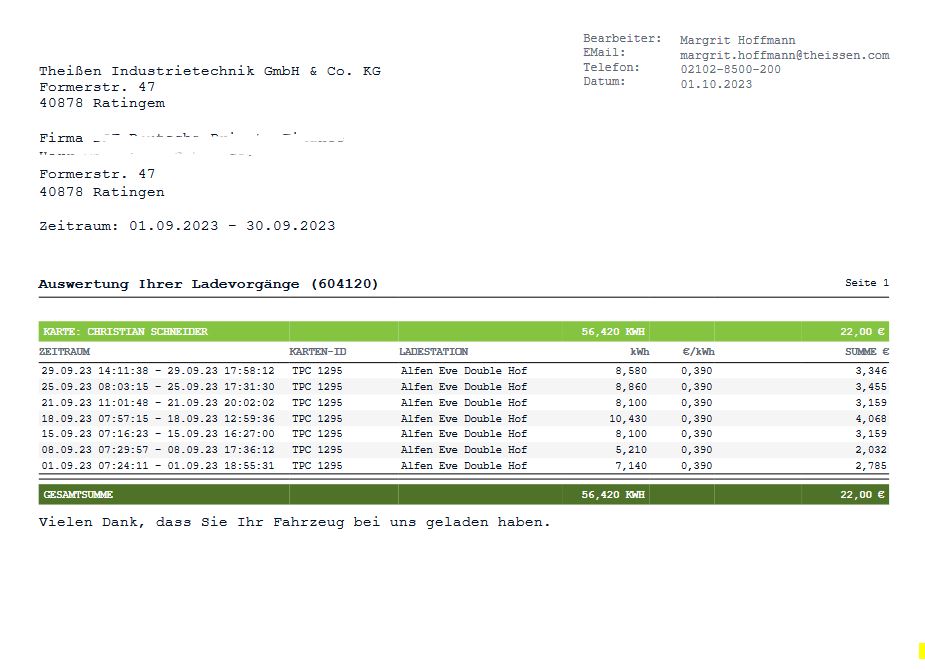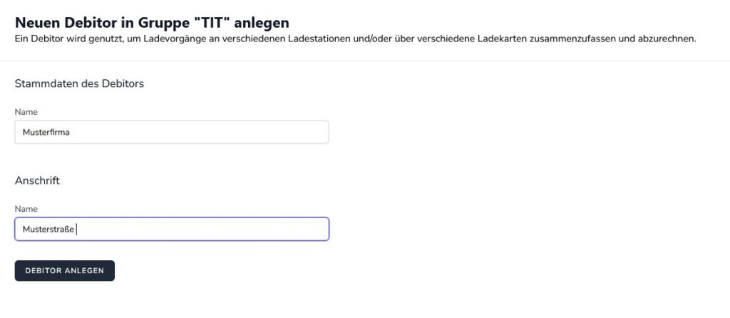 Die Debitorenverwaltung erlaubt das Anlegen und Editieren von Debitoren, also Rechnungsempfängern. Ein Debitor erhält einen Abrechnungsbeleg pro Monat, in dem eine beliebige Anzahl von Ladetransaktionen zusammengefasst wird. Die Transaktionen werden mit Preisen ausgewiesen. Die Preise sind für jeden Debitor einstellbar. Der Abrechnungsbeleg stellt keine Rechnung dar – diese muss außerhalb des Backends in dem von Ihrem Unternehmen genutzten kaufmännischen System generiert werden.