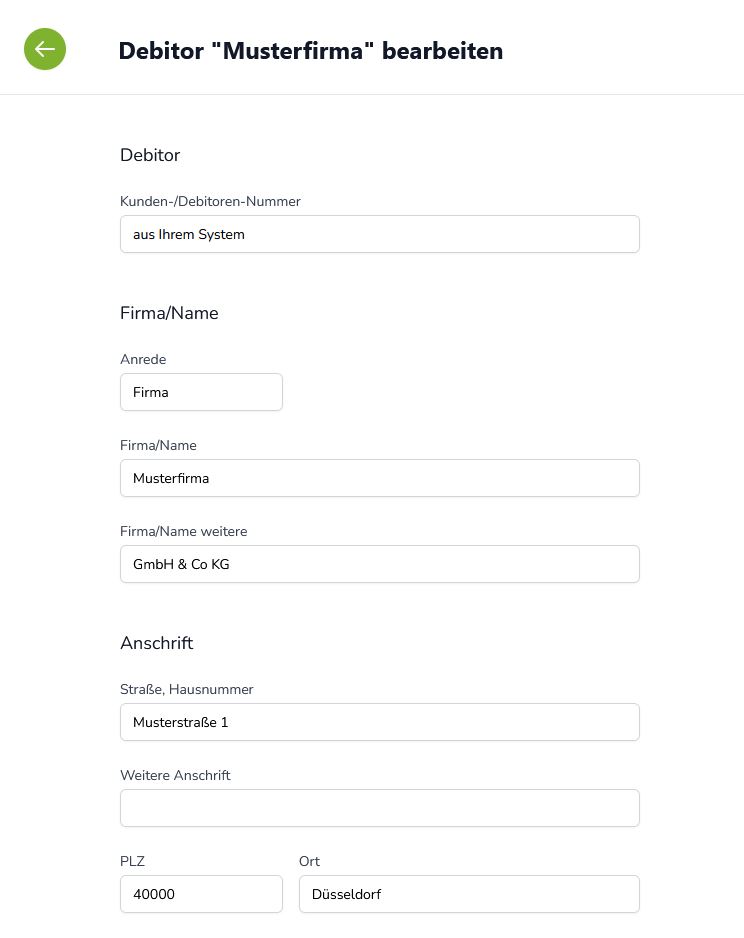 Im Bearbeiten-Formular können Sie den neuen Debitor nun um weitere Stammdaten ergänzen, z.B. auch die Kundennummer aus Ihrem vorhandenen kaufmännischen System (Debitoren-Nummer). Diese Nummer wird im PDF Abrechnungsbeleg auch angedruckt und erleichtert die Zuordnung: