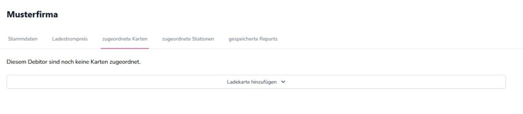 In den Debitoreneinstellungen wählen Sie das Tab “zugeordnete Karten” oder das Tab “zugeordnete Stationen”. Beide funktionieren gleich. Sie erhalten über das Dropdown Menu “Ladekarte/Ladestation hinzufügen” Zugriff auf alle Karten / Stationen der aktuellen Gruppe (siehe Gruppen und Berechtigungen).