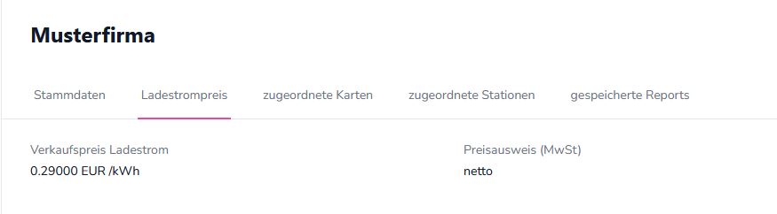 In den Einstellungen für den Debitor wählen Sie das Tab “Ladestrompreis“, um den aktuell eingestellten Ladestrompreis einzusehen: