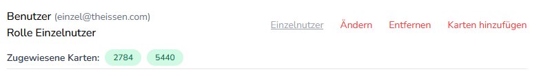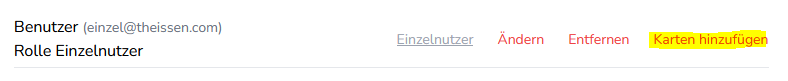 Wenn der Benutzer angelegt ist, können ihm oder ihr bereits existierende Ladekarten aus der aktiven Gruppe über das Benutzertool mit dem Link “Karten hinzufügen” zugeordnet werden.