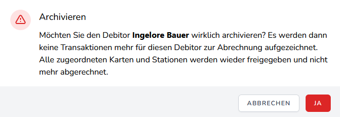 Bei der Archivierung werden die zugeordneten Karten und Stationen entfernt. Die Transaktionen werden dann sofort nicht mehr diesem Debitor zur Abrechnung zugeordnet.